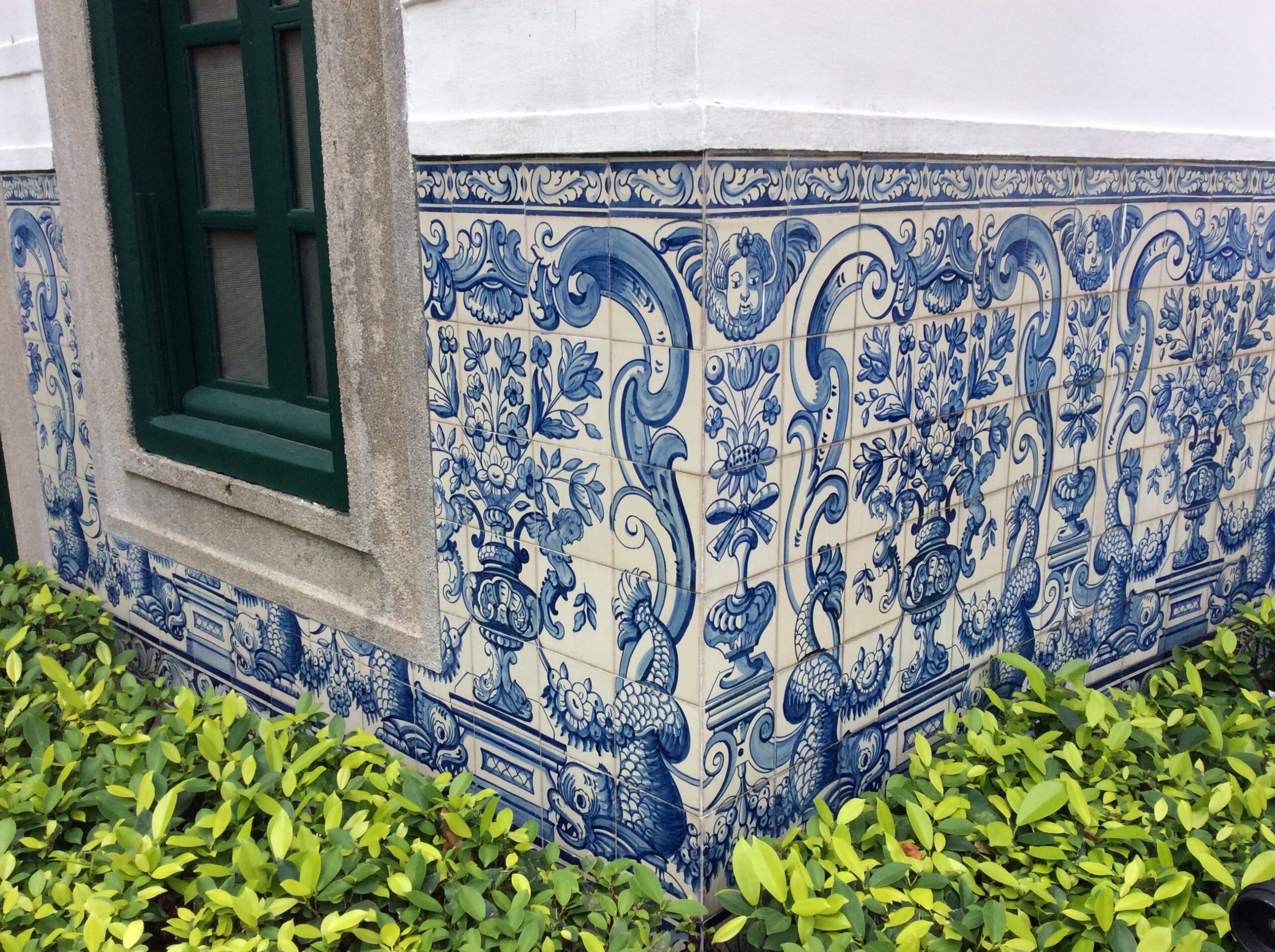 アズレーショ(ポルトガル絵タイル)の藍が熱帯性の赤い花に際立ち、