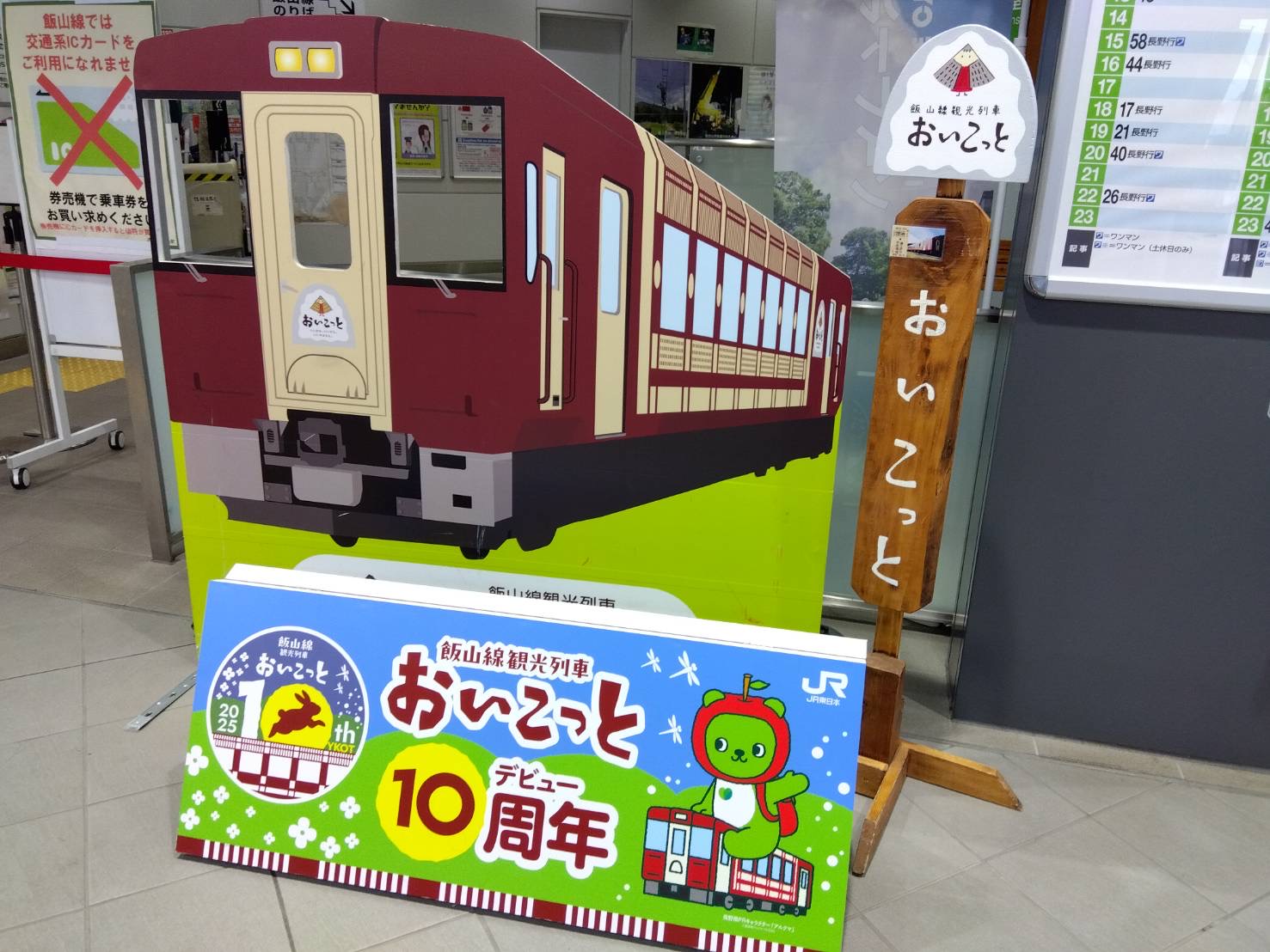 飯山駅では、観光列車「おいこっと」の看板も。