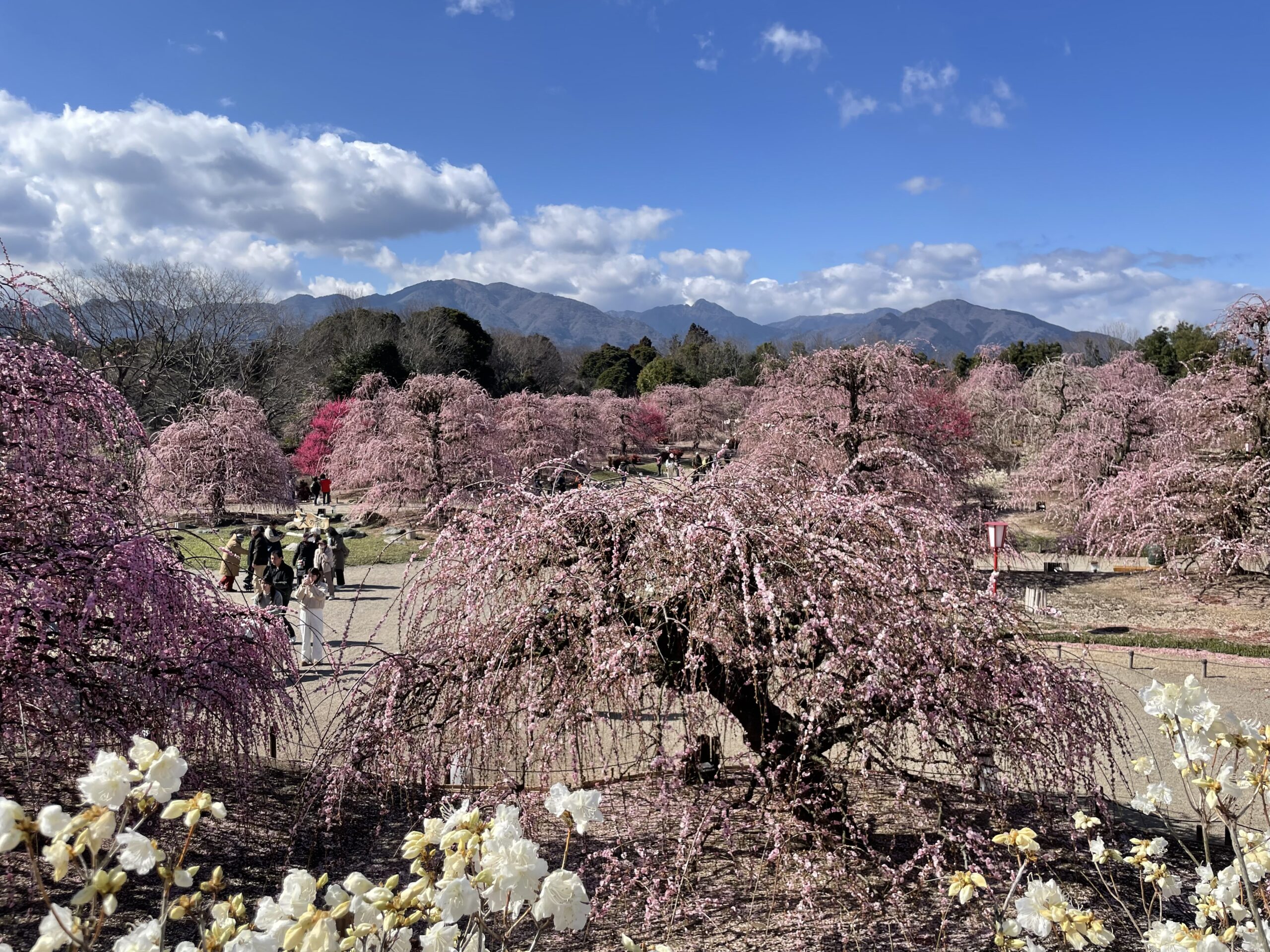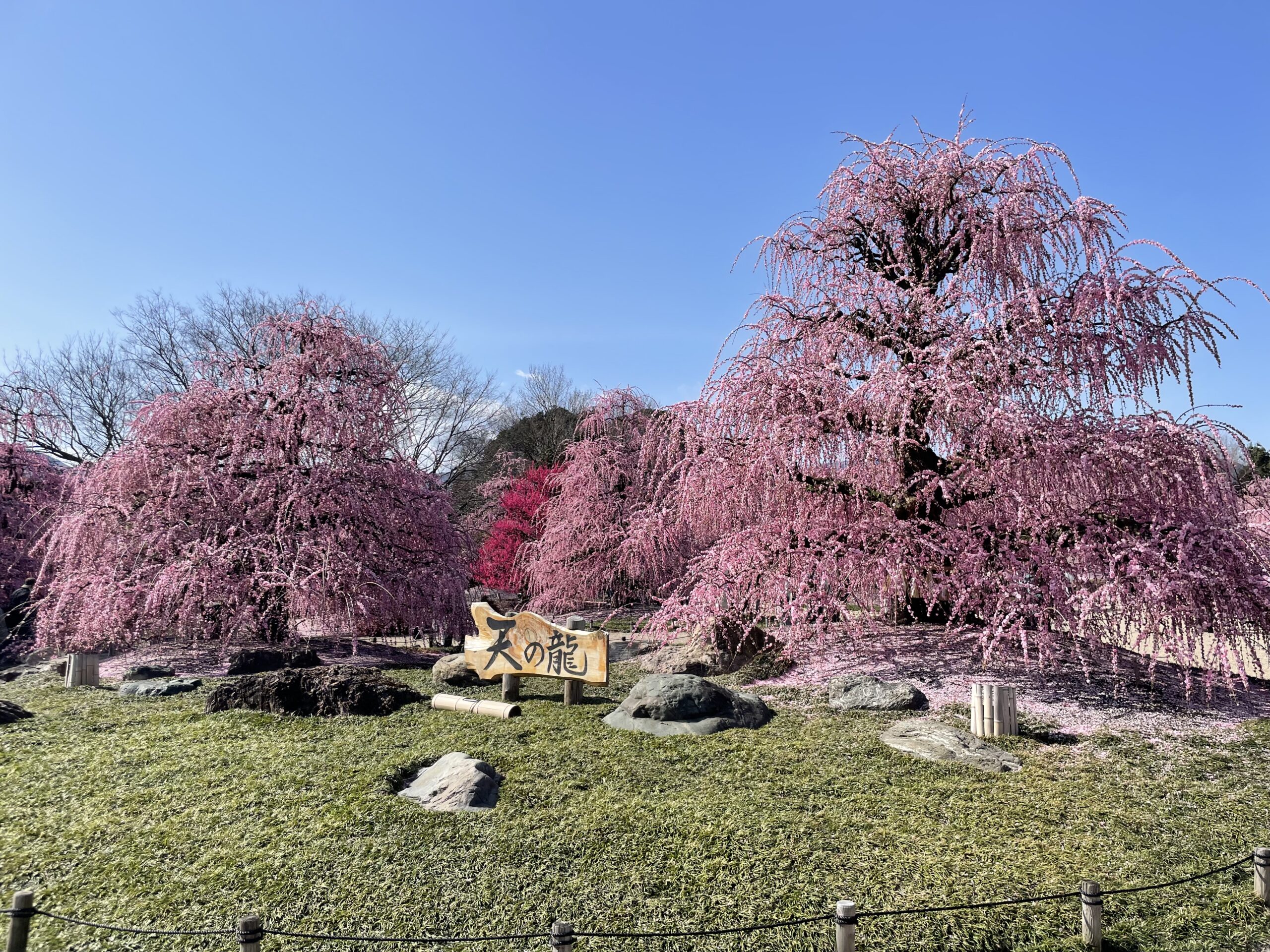満開の枝垂れ梅はまさに桃源郷です。