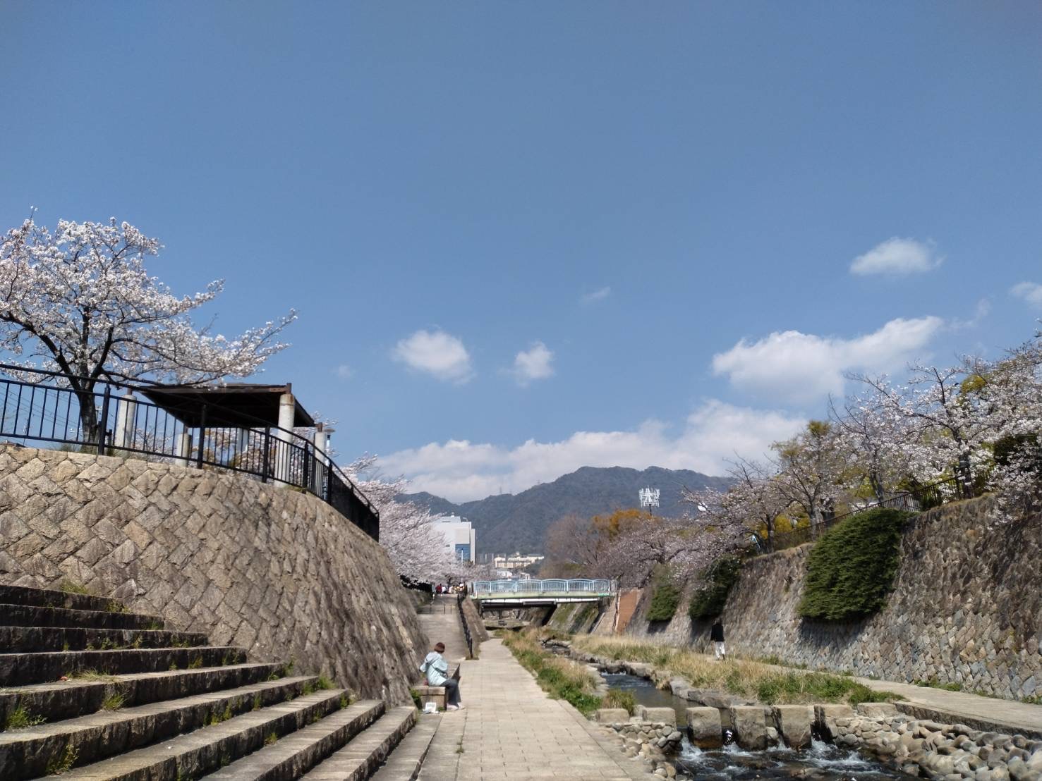 神戸、桜満開の都賀川沿を歩いてきました。
