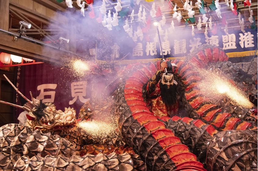 初めて石見神楽を本場で見た時の感動は今でも鮮明に覚えています。イメージする荘厳な神楽とは全く違います。まず舞台の狭さ。ここであの大蛇がうねうねと舞い暴れるのですから、いまにも大蛇の尾っぽが当たり そうなほどの臨場感。触れるほど間近で、熱気も迫力もケタ違いです。演じているのは地域の若者たち。上演後、舞台にズラリと並び大汗をぬぐって深々と礼をする姿は、どれほど清々しかったでしょう。伝統芸能が確かに引き継がれている、そう思い、あの時思わず涙したことを思い出しました。